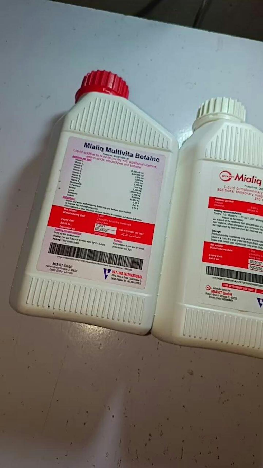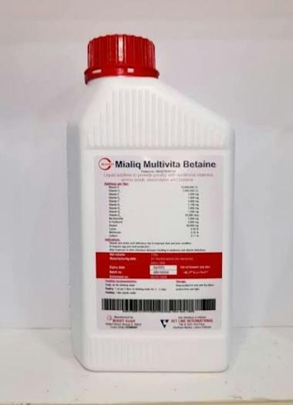 Mialiq Multivitamin Betaine is a premium-quality liquid additive imported from Germany (Mialiq), designed to boost poultry health, growth, and productivity. This powerful supplement contains essential vitamins, amino acids, electrolytes, and betaine, which help prevent deficiencies caused by improper feed or poor environmental conditions. By improving digestion, protein absorption, and feed conversion ratios (FCR), it ensures optimal growth and performance in poultry.