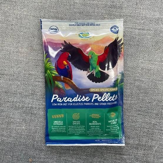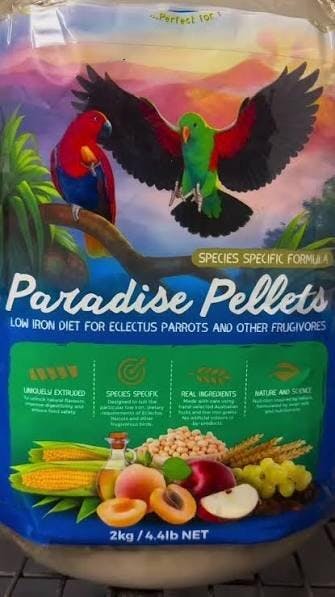 Paradise Pellets are a species-specific, complete balanced diet developed by avian veterinarians to meet the low-iron dietary needs of Eclectus Parrots and other frugivorous birds. Inspired by nature, this formula is based on a fruit-rich diet and made using fresh seasonal fruits and carefully selected low-iron grains to support long-term health and prevent iron storage disease.