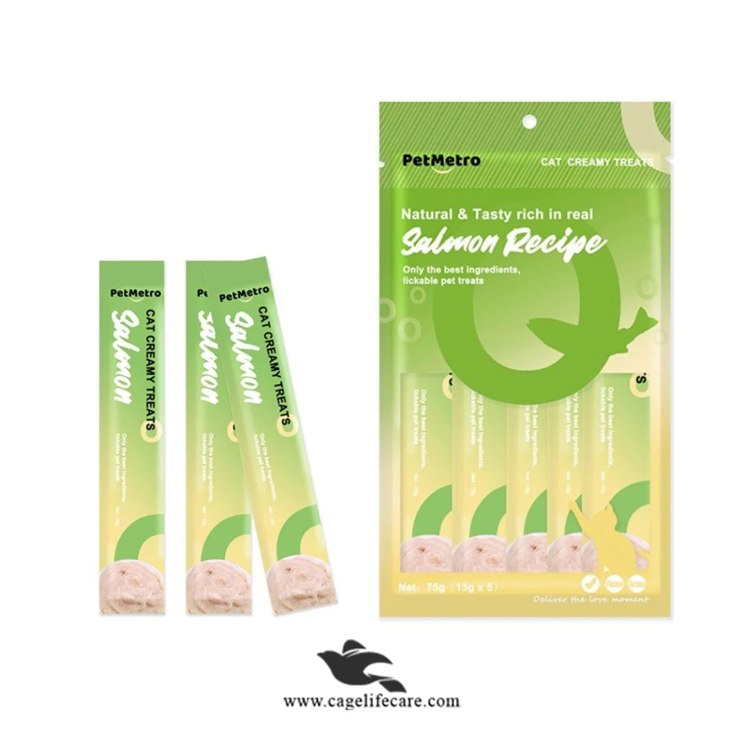 Pet Metro Creamy Lickable Treats for Cats, crafted from real chicken, salmon, and tuna. With a silky-smooth texture and irresistible taste, these creamy treats are designed to satisfy even the pickiest cats while delivering essential vitamins and minerals for complete wellness. Each pack contains five 15g single-serve sachets, keeping every serving fresh, convenient, and mess-free.