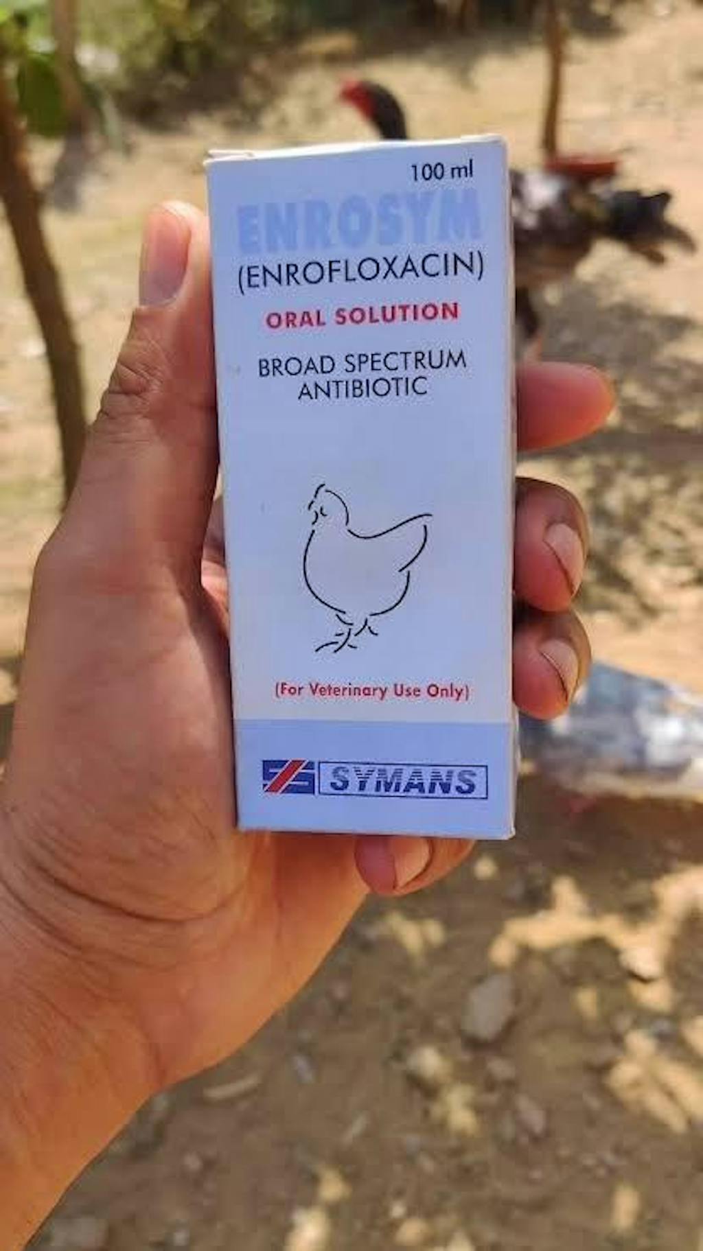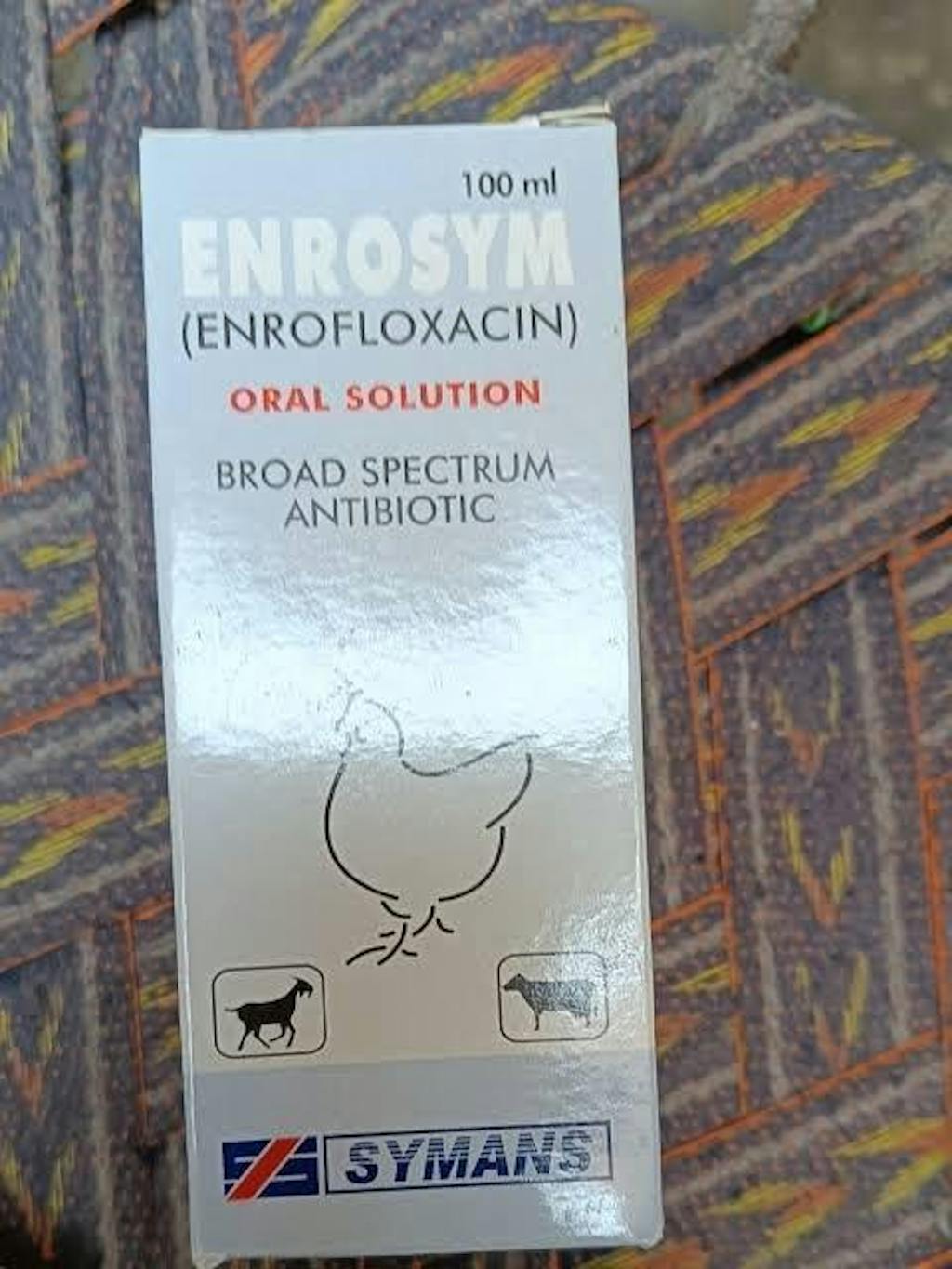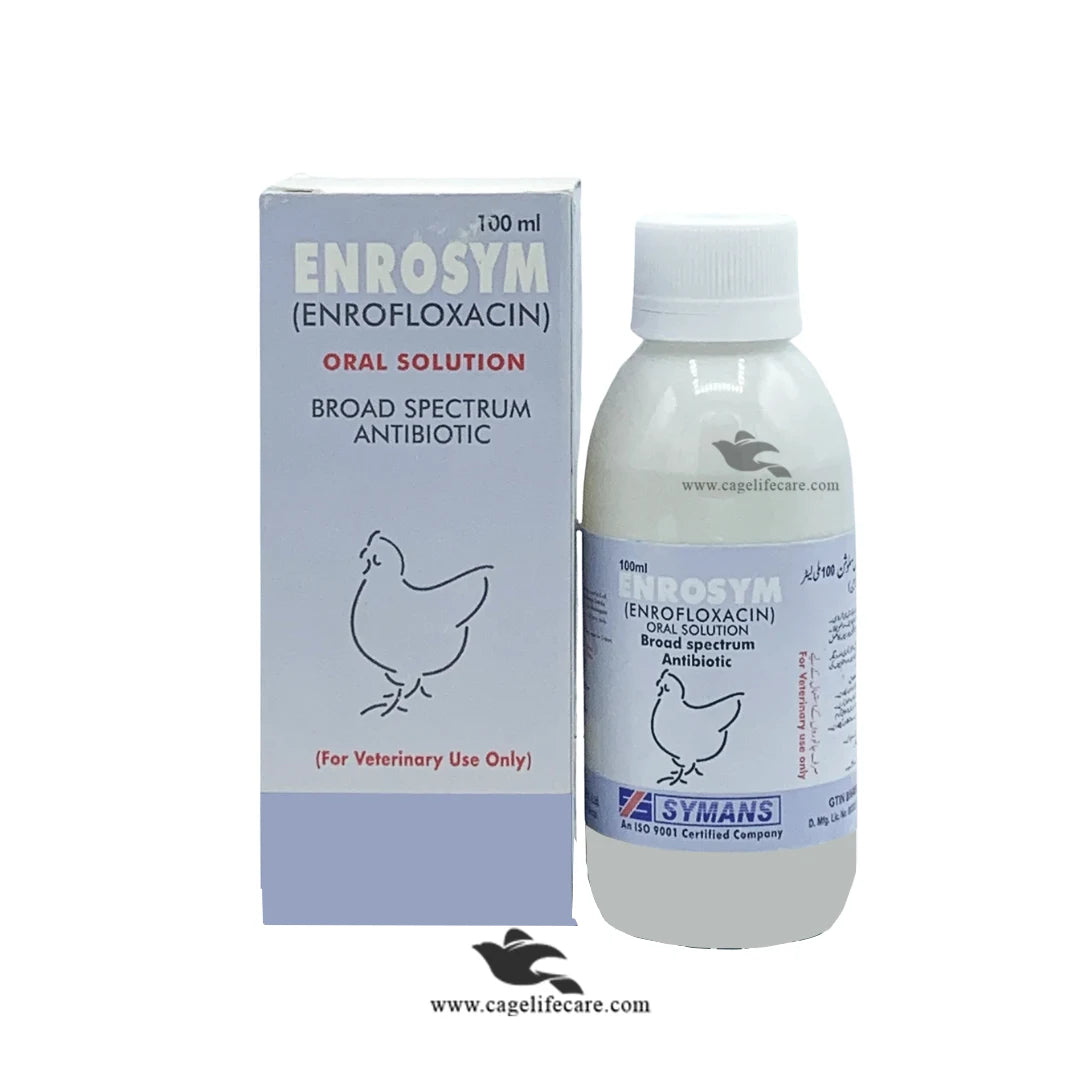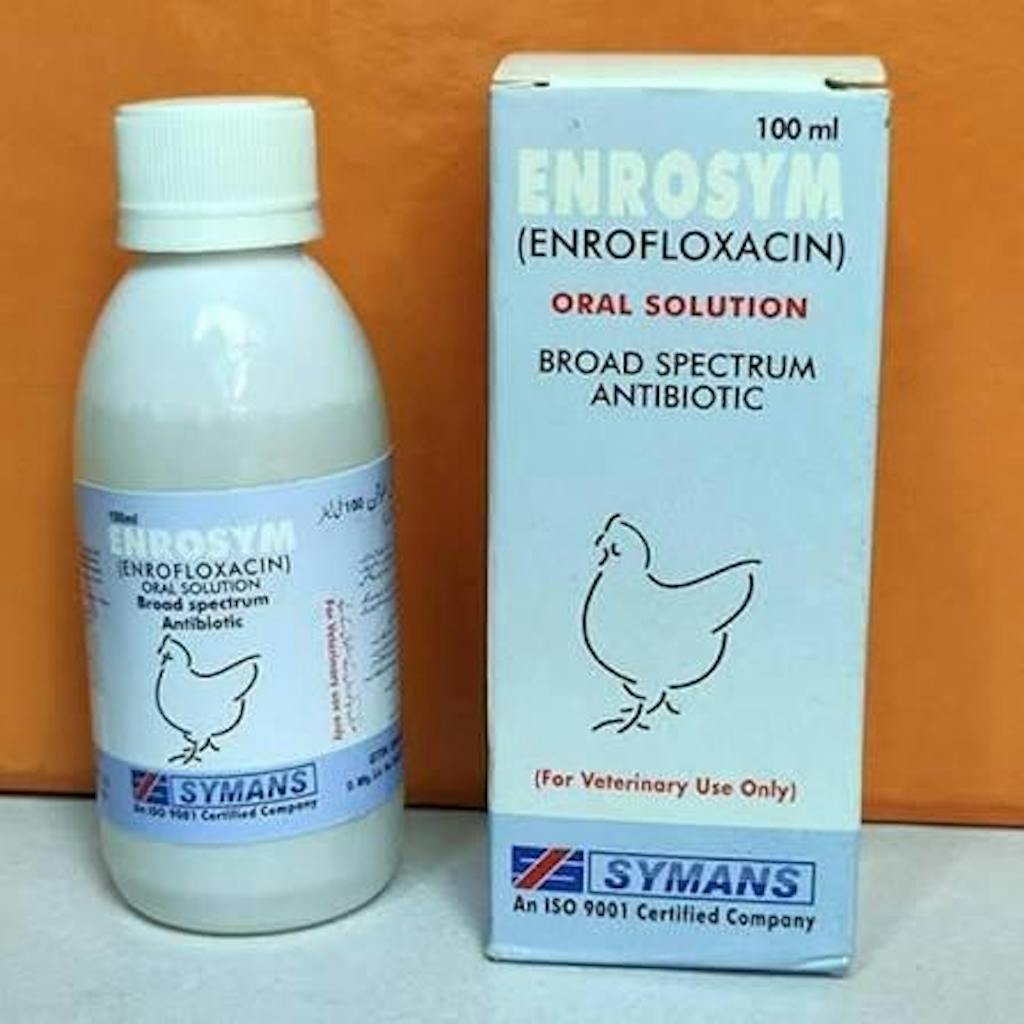 Enrosym Oral Solution is a highly effective, broad-spectrum antibiotic containing Enrofloxacin (10g per 100ml), a potent fluoroquinolone widely used for treating bacterial infections in poultry, fancy birds, cattle, goats, and sheep. It combats a wide range of harmful bacteria, including E. coli, Salmonella, Mycoplasma, Pasteurella, Haemophilus, Klebsiella, Pseudomonas, Clostridia, and Chlamydia, making it an essential solution for poultry farms, breeders, and veterinarians.