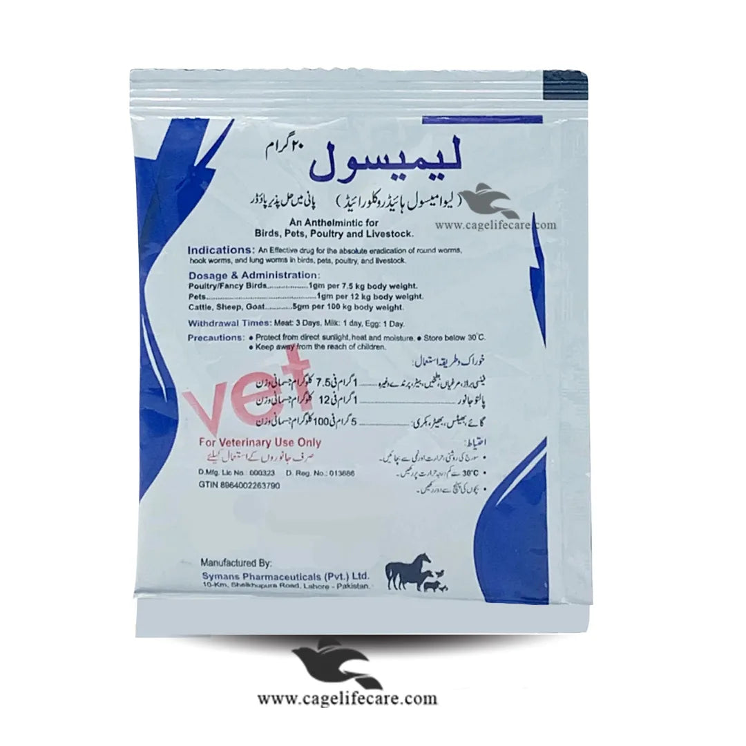 • Levamisole HCl: 15g – A potent anthelmintic effective against roundworms and lungworms.