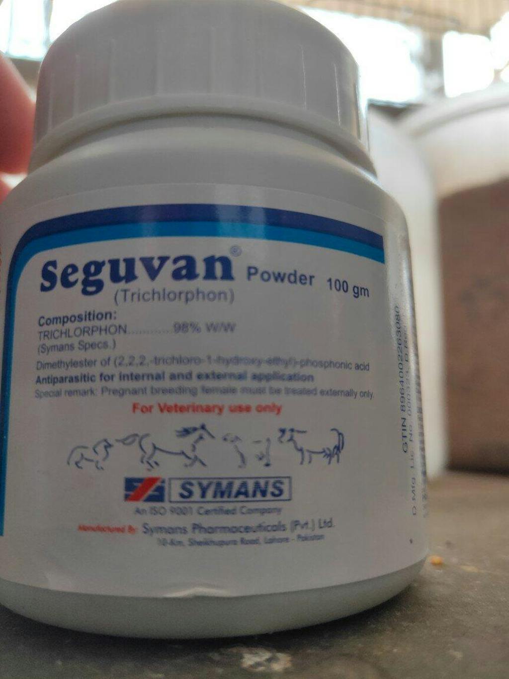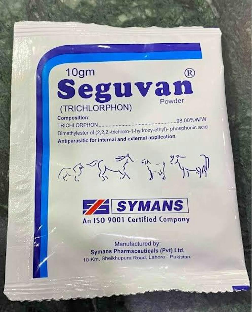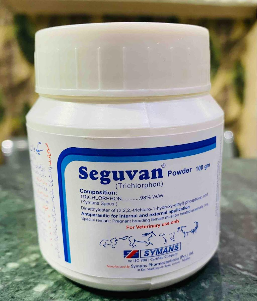 Seguvan Powder Spray is a highly effective parasitic treatment designed to eliminate both external and internal parasites in poultry, cattle, sheep, goats, and horses. Formulated with Trichlorphon 98% w/w, this powerful solution targets mites, lice, fleas, ticks, nasal bots, screw worms, and gastrointestinal parasites, ensuring the health and well-being of your animals.