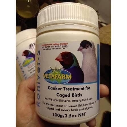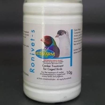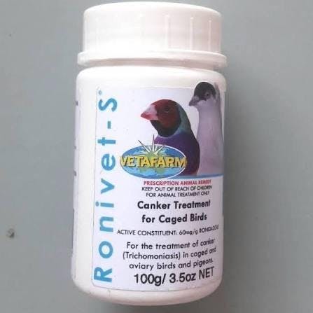 Ronivet S is a veterinarian-formulated treatment for Canker (Trichomoniasis) in caged and aviary birds, including pigeons, budgerigars, and other species. It effectively targets Trichomonas gallinae, eliminating the parasite and ensuring bird health. Imported from Vetafarm Australia, Ronivet S is a trusted choice for breeders and pet bird owners.