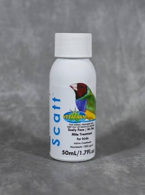 Scatt is a veterinarian-approved treatment designed to combat Scaly Face Mite (Knemidokoptes pilae) and Air Sac Mite (Sternostoma tracheacolum) in birds like budgerigars, finches, and canaries. Imported from Vetafarm Australia, this easy-to-use topical solution effectively eliminates mites and prevents reinfestation, ensuring the health and comfort of your birds. When searching for scatt for birds, this treatment is trusted by avian specialists for its proven effectiveness.